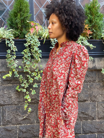Hand block printed shirtdress with puffed sleeve, ruffled collar and Mother of Pearl button placket. Can be worn with and without matching fabric tie belt.