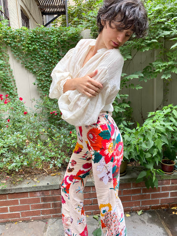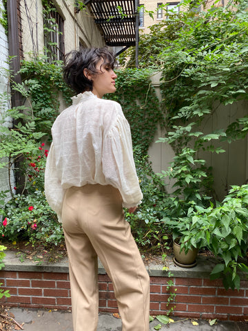 Crafted from lightly textured cream colored voile, this blouse features a dramatic Poet's sleeve and ruffled collar. Mother of Pearl Button front. One size fits sizes 4 through 10.